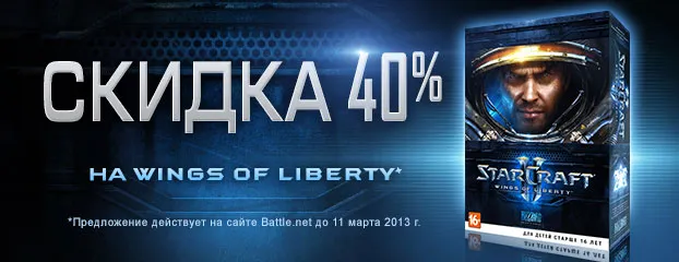 Начиная с сегодняшнего дня — и всего до 11 марта, — на StarCraft II: Wings of Liberty действует специальная скидка: до 40%. Первое дополнение к StarCraft II, Heart of the Swarm, выходит 12 марта. Так что если вы давно собирались попробовать Wings of Liberty — сейчас самое время! Такой возможностью нельзя не воспользоваться!