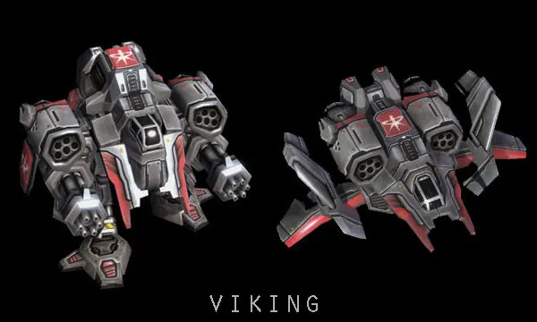 Первый юнит доступный сразу после постройки старпорта (для которого требуется барак и факторка как и в SC1) это Викинг (Viking). Как многие из вас уже знают, главный приоритет викинга-воздушные бои, также у него есть способность, позволяющая ему трансформироваться в голиафоподобного наземного юнита с атакой класса земля-земля.