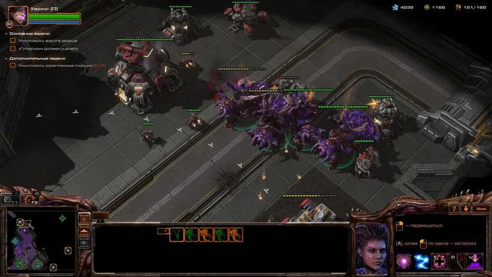 Сами миссии? Не считая "эволюционных", их всего 20. Из "чего-то такого" после прохождения вспоминается разве космический бой с пиратами на "Гиперионе". Остальные задания абсолютно обычные: "соберите столько-то этого", "продержитесь столько-то", "уничтожьте силовое поле" и, наконец, "убейте воооон тех плохих парней". Во славу Роя, ага. Причём в Heart of the Swarm гораздо сильнее, чем в Wings of Liberty, чувствуется рука Дастина Броудера: местами казалось, что играешь не в StarCraft, а в какую-то из частей Command & Conquer.