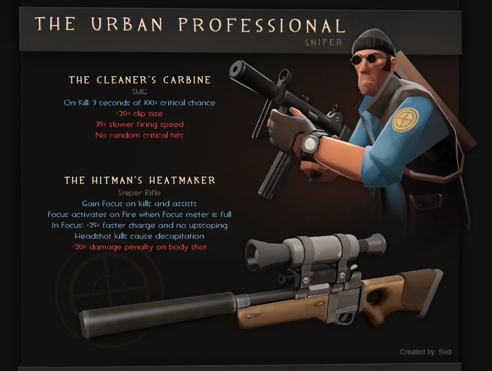 Набор The Urban Professional состоит из "тихого" СМГ (Cleaner's Carbine) и снайперки с глушителем (Hitman's Heatmaker) (моя мечта!). Шикарный набор, уже хочется подержать в руках. Шапка с отворотом и очки "аля Джон Леннон" прилагаются к набору. Хотелось бы верить... =Ь Как подметил товарищ Bill-Z, хладнокровный снайпер предстал к нам в образе Леона!