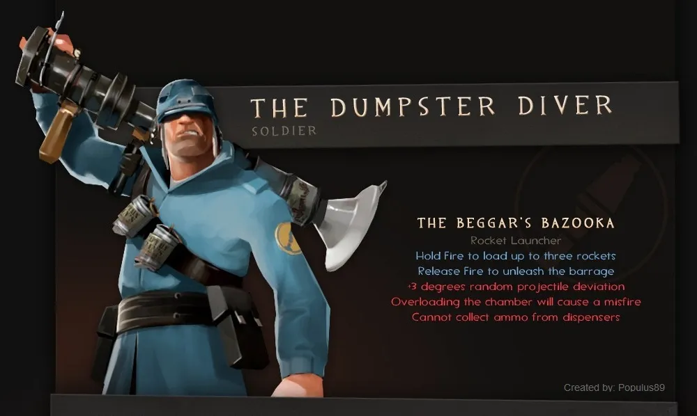 В наборе The Dumpster Diver представлена только базука (Beggar's Bazooka) (снова внушительных размеров!). Она впервые была представлена в видео Team Fortress 2 is Free to Play. В качестве головного убора у бравого Солда одет стилизованный мотоциклетный шлем (или не мотоциклетный), а на груди висят консервные банки. Что ж, смело!