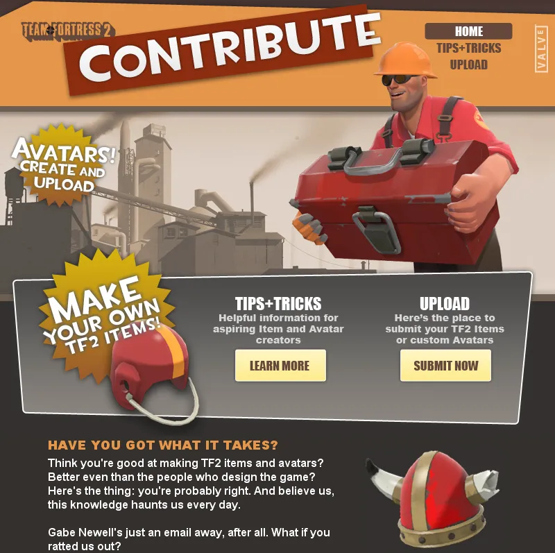 Хотите сделать свою собственную вещь в стиле TF2? Пожалуйста!! с помощью этого сайта. "Отправьте нам ваш предмет или аватару и мы возможно используем их игре. За это вы сможете получить что-то в подарок." Думаете, что вы - лучший дизайнер, чем создатели игры, тогда дерзайте!