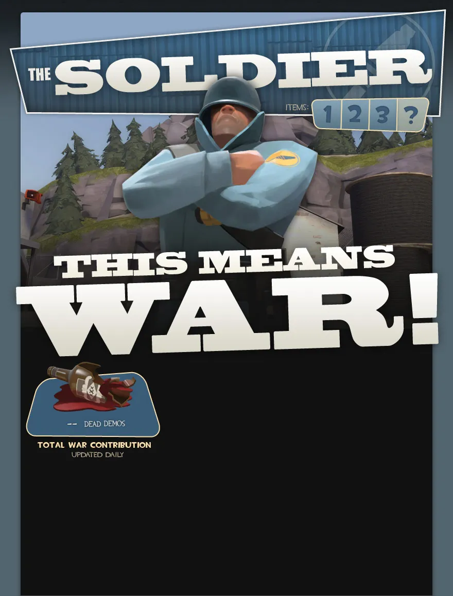 Отличие в том, что в этот раз мы решили немного перемешать вещи, или, как сказала Администратор: "Устроить здоровое соревнование". Нашими дизайнерами было разработано секретное "седьмое" оружие. Другими словами кто-то, Солдат или Подрывник (но не тот и другой), получат еще одну пушку. Если вы хотите, чтобы именно ваш любимый класс ее получил, то за нее придется сражаться. Чем больше подрывников вы убьете солдатом, тем больше шансов, что именно ваш класс получит новое средство убиения. И наоборот. Больше убийств солдат подрывником - больше шансов на победу. Текущие результаты можно посмотреть на специальной страничке войны, которая обновляется ежедневно.