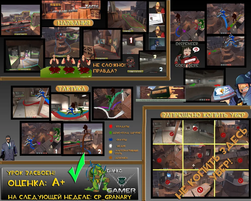 а) Все противники мертвы: Скауты остаются на центре, а абсолютно все остальные силы продвигаются до второй точки (медик+солдат справа; демо+солдат слева). Далее эти 4 игрока стоят у бочки, постоянно оглядываясь и копят убер (если не накоплен). Если убер уже накоплен - срочно нападают на вторую точку.