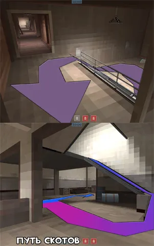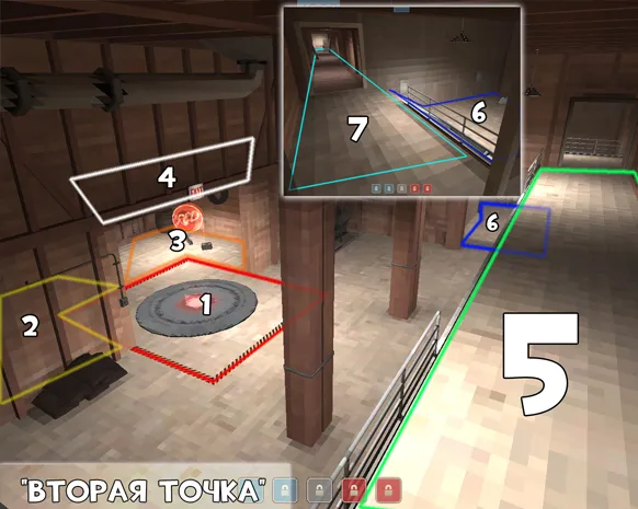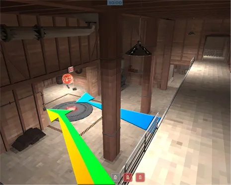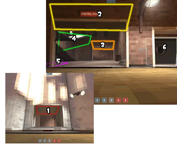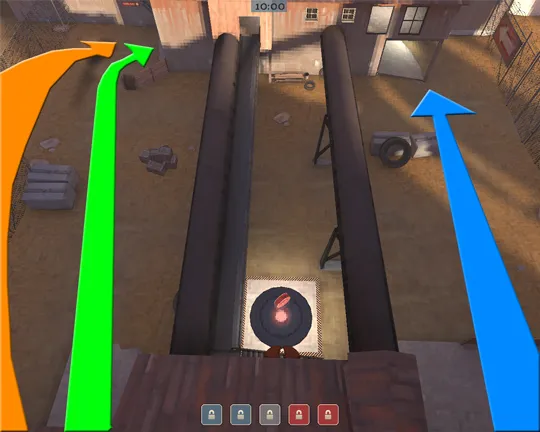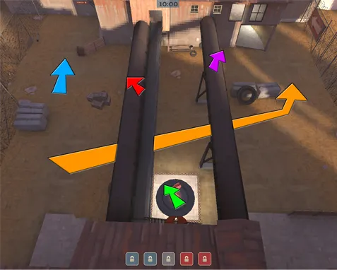 Примечание: вместо демомана на ящик может запрыгнуть и солдат, в таком случае красная и коричневая стрелки как бы меняются местами. Не исключено и то, что оба игрока запрыгнут на ящик. Но только в том случае, если оба вражеских скаута мертвы .