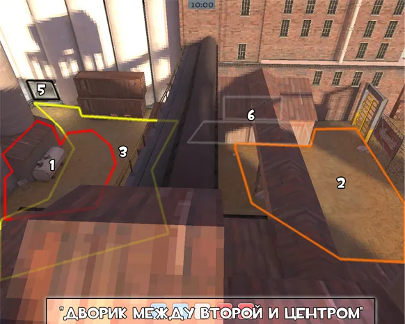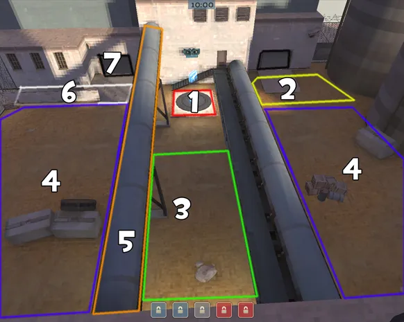 4. Ящики (на ящиках, красных/синих). На них всегда прыгают солдаты и демоманы противника. Медику оттуда лучше держаться подальше. (Помните, что с вашей стороны по левую и правую сторону (если вы смотрите вперёд) всегда будут ящики цвета вашей команды).