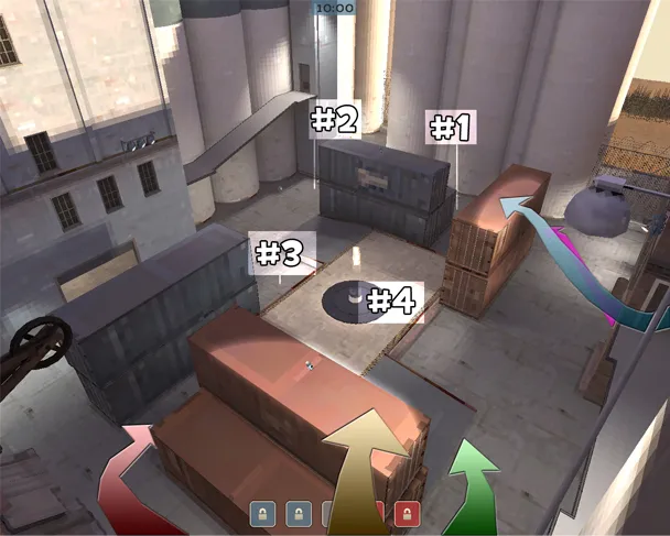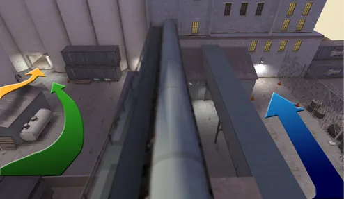 1. Один скаут (Голубая стрелка) заходит сверху и прыгает на ближайший контейнер. Оглядывается и около секунды прячется с вида.