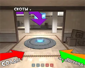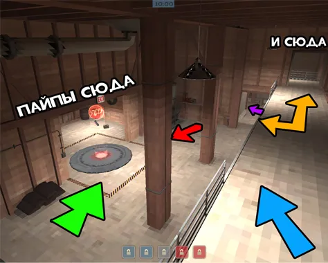 - За эти три секунды демоман и солдаты должны сделать всё, чтобы быть ближе к левому выходу, медик в это время должен лечить тех, кто ещё не допрыгнул до шкафчика.