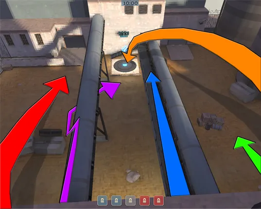 - Подрывник (коричневая стрелка) делает пайп-джамп прямо на точку, или за неё.