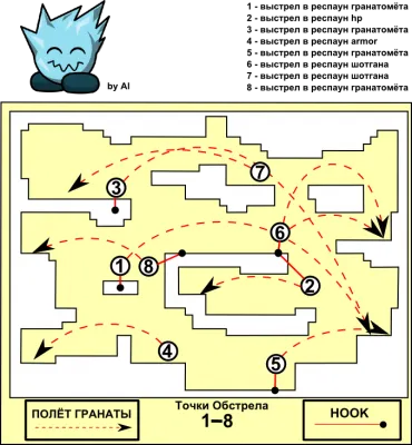 Узнайте о популярных точках обстрела с гранатомёта на карте dm1 в Teeworlds. Обзор 8 точек с траекториями, тактиками выстрелов и стратегиями для успешной игры.