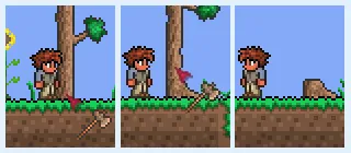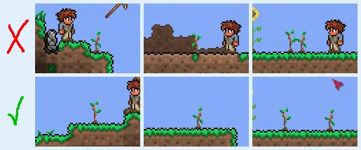 Когда рубите дерево, цельтесь в самое его основание, иначе будут оставаться пеньки. А там, где стоят пеньки, неудобно строить. Кроме того, невозможно выкопать блоки земли, на которых стоит пенек, и в этом месте нельзя ничего посадить.