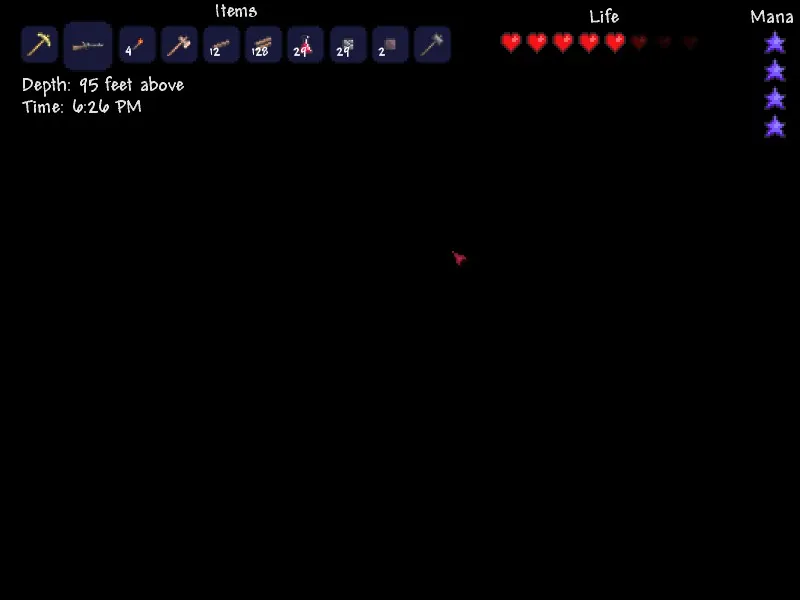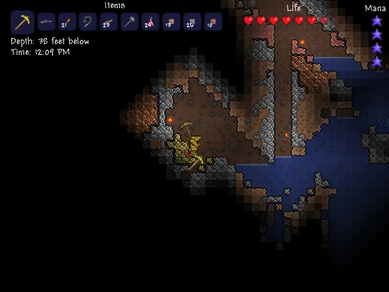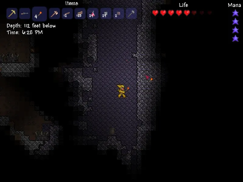 Второе немаловажное влияние 2D проявляется в том, что роль поверхности резко снизилась. Ради придания «компактности» миру в Террарии был создан довольно разнообразный подземный мир. Это вынужденная и очень разумная мера: ресурсы здесь берутся далеко не из воздуха, а вполне натурально добываются киркой/топором. И в большинстве своём не являются возобновляемыми.