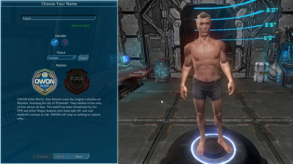 Далее наш путь лежит в редактор создания персонажа. Где в первую очередь мы выбираем имя, пол, голос, а также стартовую нацию:
