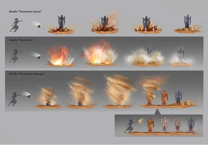 Песочная бомба взрывается, нанося урон огнём и песком, а также ослепляет противников;