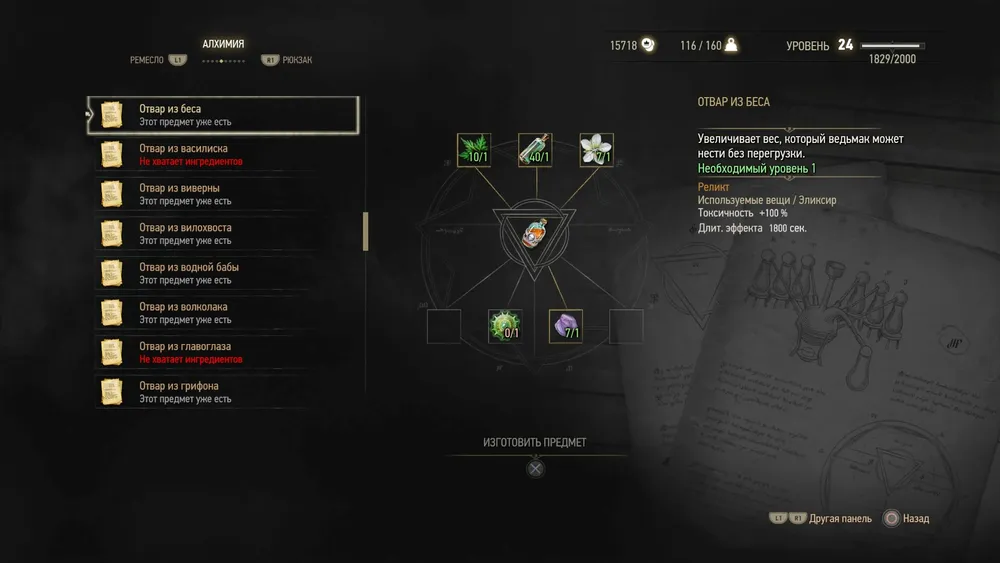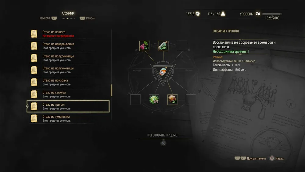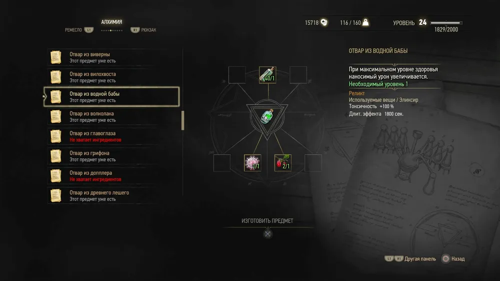В третьей части игры к стандартным ведьмачьим алхимическим микстурам (эликсирам, маслам для меча и бомбы) добавили отвары. Они похожи на специальные мутагены из первой части. Помните, такие мутагены мы варили с использованием уникальных ингредиентов, выпадавших с монстров-боссов. Изготавливались они в единичном экземпляре и применялись для активации ряда конкретных умений. Так было раньше. Сейчас каждый отвар – это восполняемый продукт, действующий в течение ограниченного периода времени. От обычных эликсиров их отличает повышенная токсичность, снизить которую невозможно никакими умениями (можно лишь поднять порог токсичности). Не поддаются они и улучшению. Тем не менее свойства многих отваров крайне полезны. На интересующем нас высшем уровне сложности особенно выручают те из них, что дают защиту от эффектов контроля (оглушение, сбивание с ног, слепота). Чуть позже рассмотрим парочку наиболее интересных отваров, а пока обсудим еще одну непростую тему – лечение.