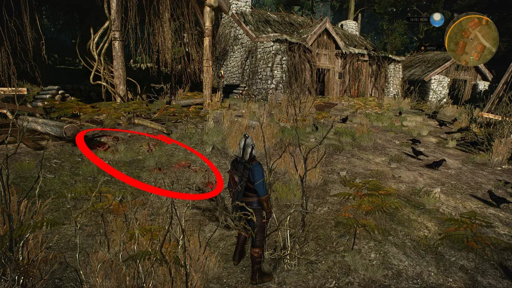 4. Теперь отправляемся за курослепом в южную часть древней пущи Морскоген. Прибыв на место, с помощью ведьмачьего чутья осматриваем отмеченную маркером цели область и обнаруживаем, что кто-то нас опередил и сорвал заветный цветок (17).