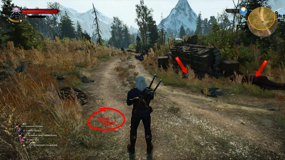 Буквально через несколько шагов нам попадется свежее пятно крови, потом еще одно пятно восточнее первого, и еще одно, и еще... Кровавая дорожка выведет Геральта на полянку, где задорно улюлюкают и скачут пять накеров 6 уровня. Причина веселья монстров станет ясна, когда их самих уже не станет: им подвалил сытный обед в виде мертвой женщины (2). Помочь бедняжке мы уже ничем не сможем, но вот порыться у нее в карманах на случай дропа чего-нибудь интересного – это без проблем.