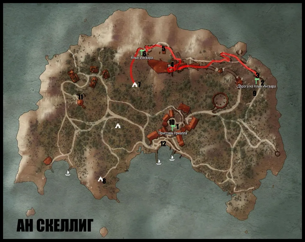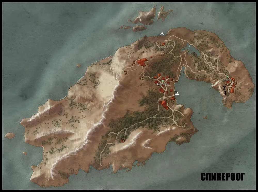Данный квест начнется автоматически, стоит Геральту оказаться в центре главного населенного пункта Ан Скеллиг – Пристани Уриалла. Он волей-неволей услышит разговоры местных о невесть откуда взявшейся на острове башне, что и активирует данное задание. Можете для начала поговорить с рыбаками (см. п. 1) в деревне, а можете сразу же отправиться к башне (см. п. 2) – дальнейшее прохождение задания от этого не изменится.