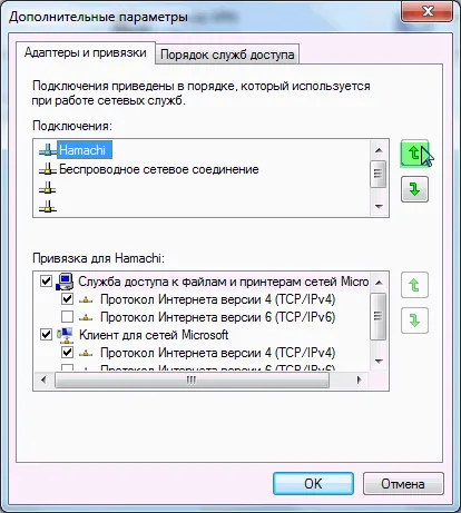 Выберете подключение "Hamachi" и кнопкой "Вверх" переместите на верхнюю позицию.