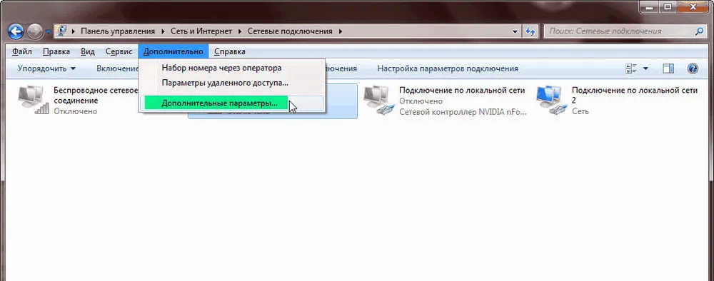 Слева в верхнем углу "Изменение параметров адаптера".