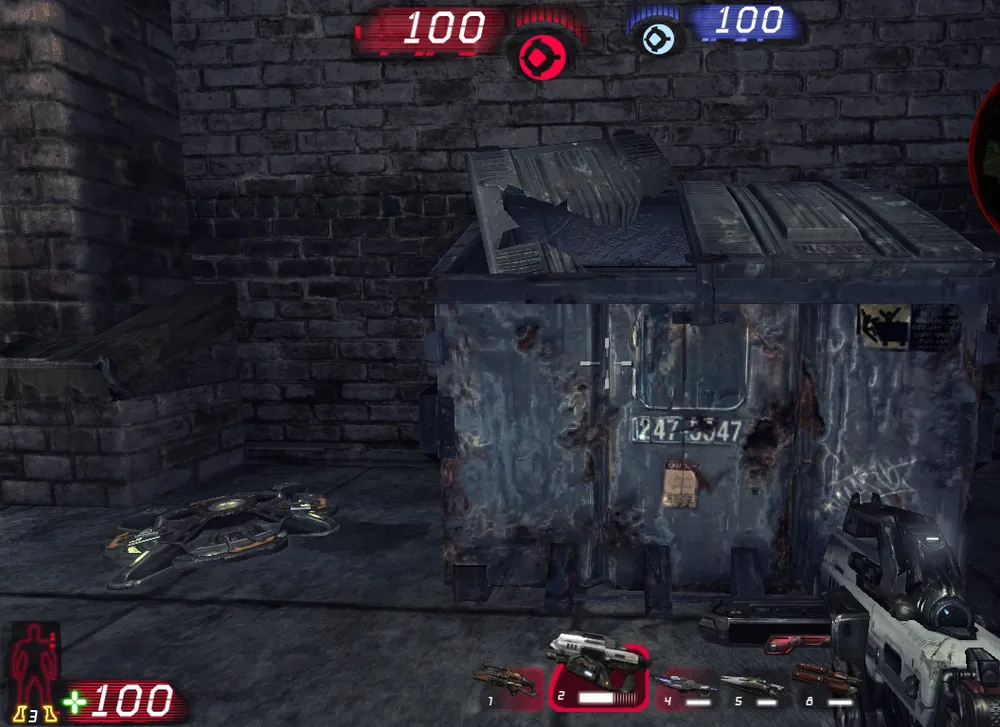 Итак, выход номер один. Попасть к нему можно так: от места возрождения идем прямо, к энергосфере, потом поворачиваем направо. Здесь нет ничего примечательного, лишь две аптечки виднеются вдали. Однако только отсюда мы можем защищать ядро от танка (вернемся к этому чуть позже). С первого выхода мы попадаем на дорогу, которая ведет к центральной точке, а точнее, к небольшому посту близ нее.