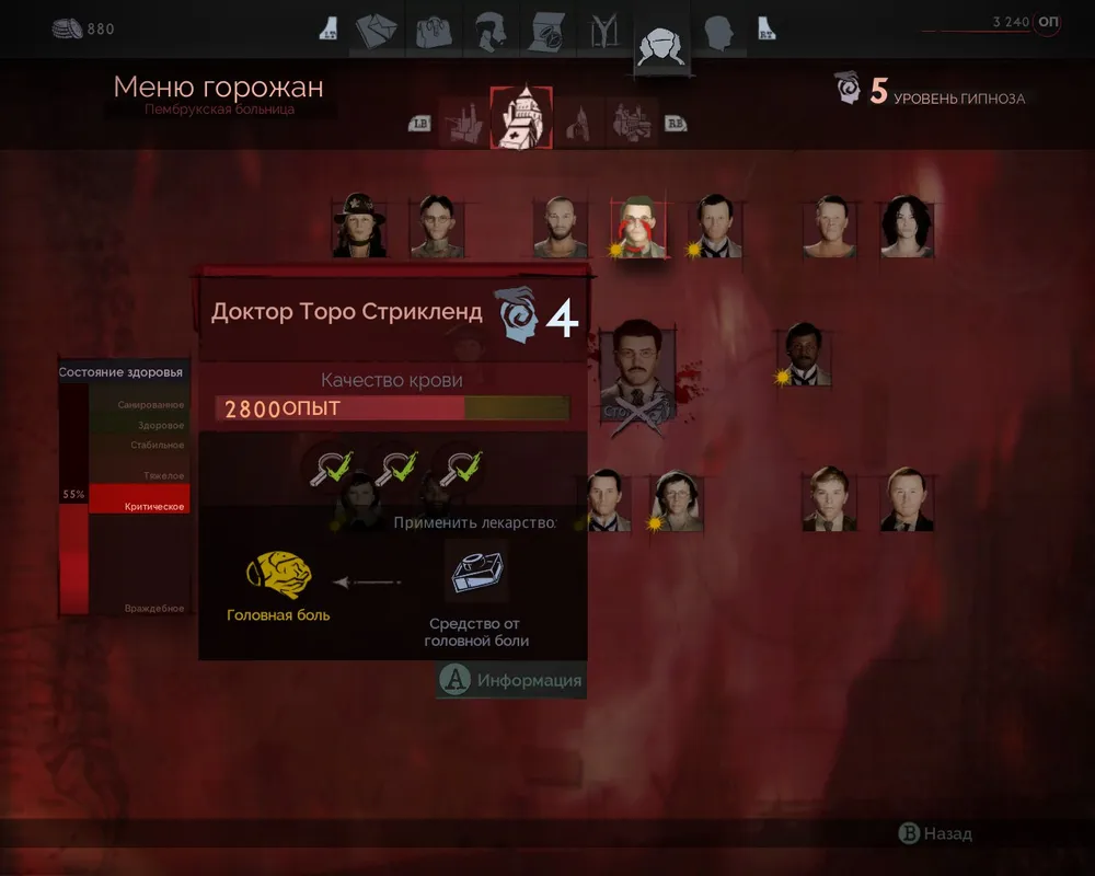 Правда, вы не сможете заполучить всех сразу — необходим определённый уровень гипноза, который повышается исключительно по сюжету. Кроме того, количество получаемого из горожанина опыта зависит от того, насколько хорошо вы знаете его (много ли «подсказок» открыли, выполнили ли связанное с жертвой расследование) и сколь крепко его здоровье в данный момент (качество крови больного человека снижается, и опыта с него выпадает меньше). Однако даже самый малознакомый и болявый «пациент» приносит тысячи единиц опыта (в сравнении с 5-10 за убийство врага).