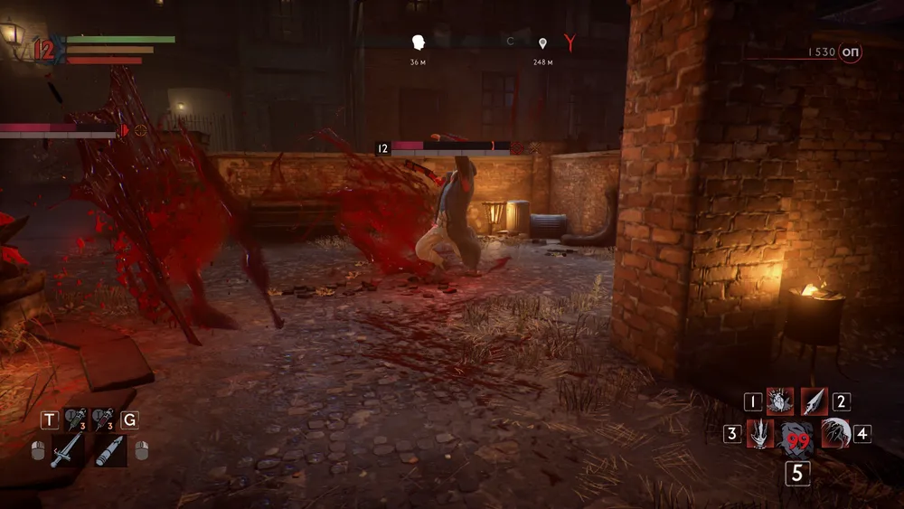 Последний (но отнюдь не по значению) нюанс боя, который я хочу упомянуть, это оглушение. Правда, оглушить противника с одного удара получается не всегда — у разных врагов разный запас «сопротивления», которое к тому же восстанавливается независимо от здоровья. Однако если вы таки нанесёте нужное количество ударов нужным оружием (в основном это колья и огнестрел, находящиеся в левой руке), то сможете вонзить в обездвиженную жертву клыки и сильно подорвать её здоровье, одновременно восстановив собственные показатели (и да, во время укуса вы неуязвимы).