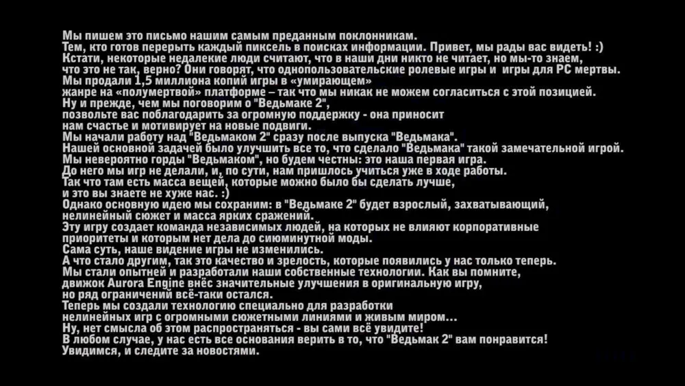 В одном из официальных трейлеров "Ведьмака 2" (посмотреть) было спрятано специальное обращение разработчиков к поклонникам первой части и тем, кто ждет продолжение. Оно было показано лишь какие-то доли секунды, но зато содержание в нем очень и очень интересное. Те слова, что написаны в письме, в очередной раз показывают нам, почему Ведьмак сейчас так успешен. И почему он притягивает все больше и больше игроков. Я думаю, все причины можно почерпнуть из данного текста: