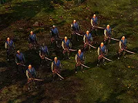 Рохиррим. Стоимость - 750. Место найма - конюшня, 2 уровень. Очки командования - 60. Преимущество против стрелков. Здоровье - 800-880 XP. Способности - другое оружие (выбор между копьем и луком). Искусные всадники Рохана полностью вытесняют гондорских рыцарей и становятся самой убойной силой нашей армии. Возможность переключения между дальним и ближним боем делает их универсальными против любого противника.