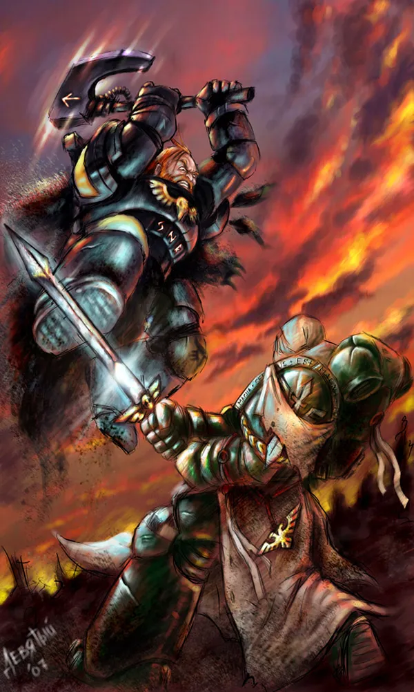 Зная, что один точный удар положит войне конец, Лев Эль’Джонсон возглавил штурм Башни Ангелов — могучей крепости, в которой укрылся Лютер. И так двое бывших друзей, ставших смертельными врагами, встретились лицом к лицу. Даже несмотря на сверхчеловеческую силу примарха, оба противника стоили друг друга, ибо и без того значительные способности Лютера были усилены дарами Тёмных Богов Хаоса.