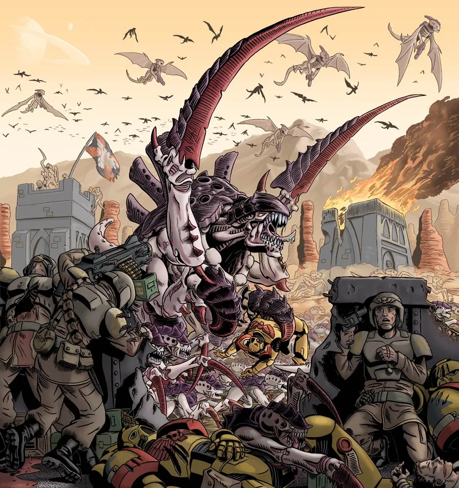 Граусс увидел тирана улья, шагавшего по пылающей растительности и потрошившего космических десантников тяжелым клинком. Сквозь дымку вдали он видел широкие омерзительные силуэты био-титанов, продвигавшихся вперед.