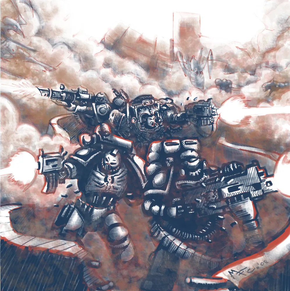 Огромные бронированные воины, опора человечества, выпрыгивали из капсул, стреляя из болтеров, огнеметов и мельтапушек. Термагантов и гормагонтов рвало на куски подавляющей огневой мощью. Огнеметы выжигали вонючую растительность. Гаргулий расстреливали, спуская с небес на землю. Граусс увидел агонию пожирателя после поцелуя мельты и его смерть. Он видел, как плазма пожирает богомола-убийцу.