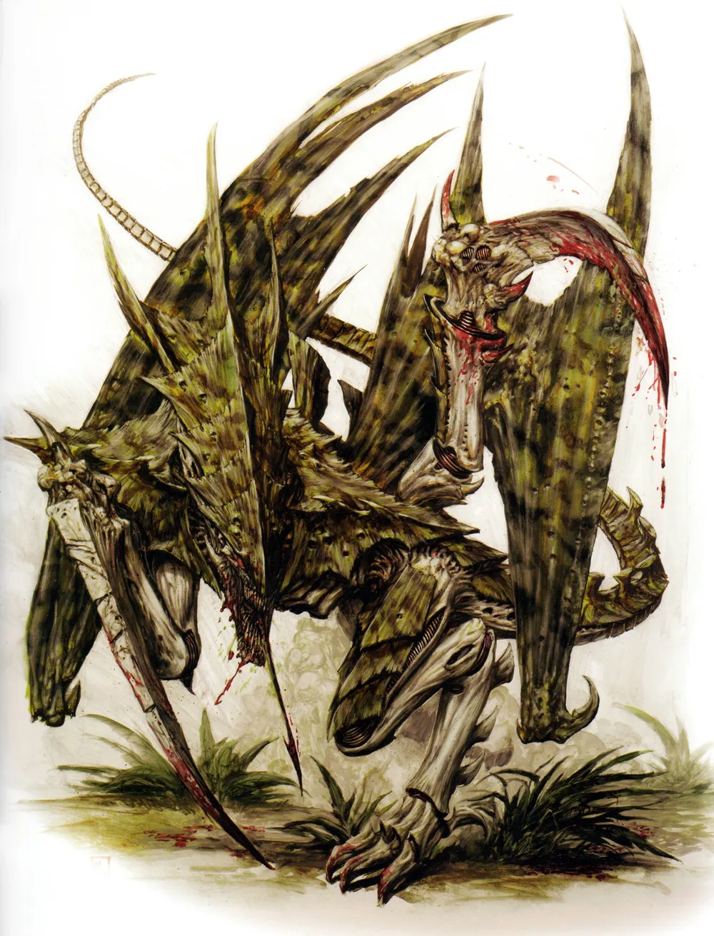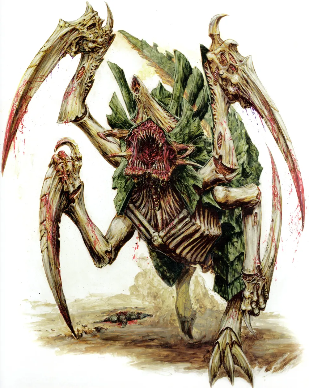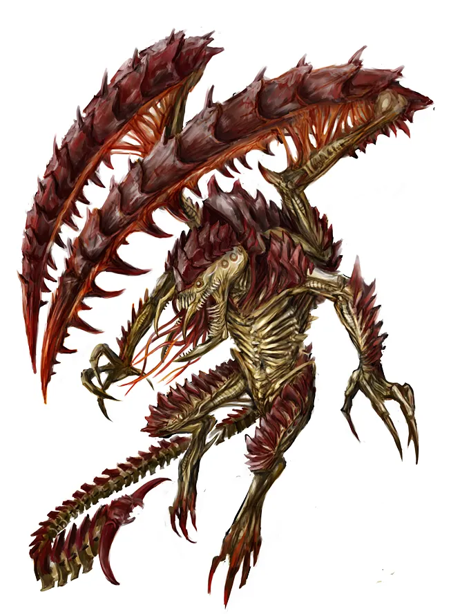 Он рухнул в укрытие, когда кучка фермеров протопала мимо в диком страхе. За ними что-то бежало, что-то выше человека, с бронированным телом на тонких птичьих ногах. Основные конечности генокрада с огромными когтями, верхние из четырех на туловище, протянулись к кричащим поселенцам, выпустив одному из них кишки. Его слюнявый язык метался между клацающими клыками.