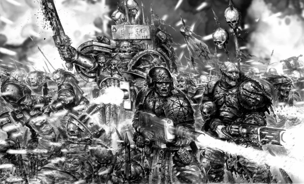 Он улучил момент, чтобы оценить ситуацию. Из укрытия за алтарём огонь вела дюжина оборванных людей. Через проёмы в дальнем конце зала спешили остальные, среди которых было немало тяжело вооружённых зверолюдей. Их вели космические десантники Хаоса в чёрных доспехах и с болтерами, изрыгающими смерть. Там даже была громадная машина, похожая на демонического робота, катившаяся вперёд на двух колёсах.