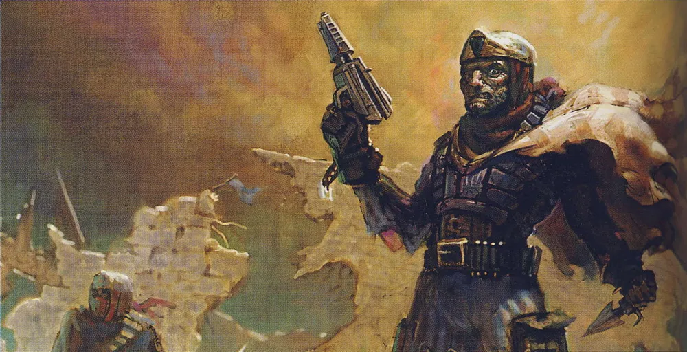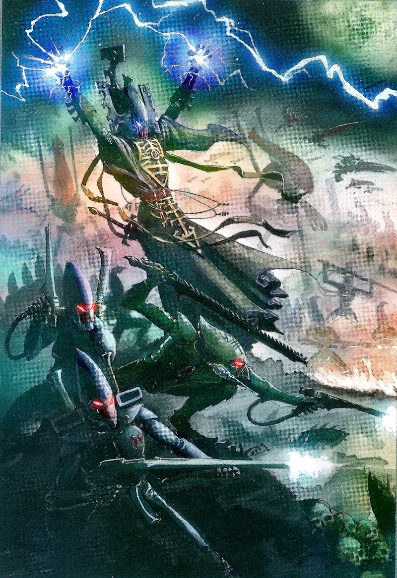 Его внимание привлекло чьё-то скрытное перемещение. Он развернулся слишком быстро для человеческого глаза, прицелившись в источник шума. На секунду он напрягся, но потом понял, что это ещё один отряд эльдаров — Пауки Искажения. Они двигались пугающе резко, а четырёхрукие доспехи делали из них демонов древних легенд.