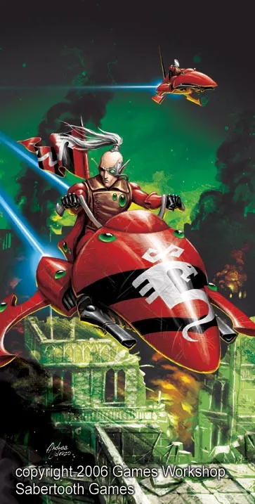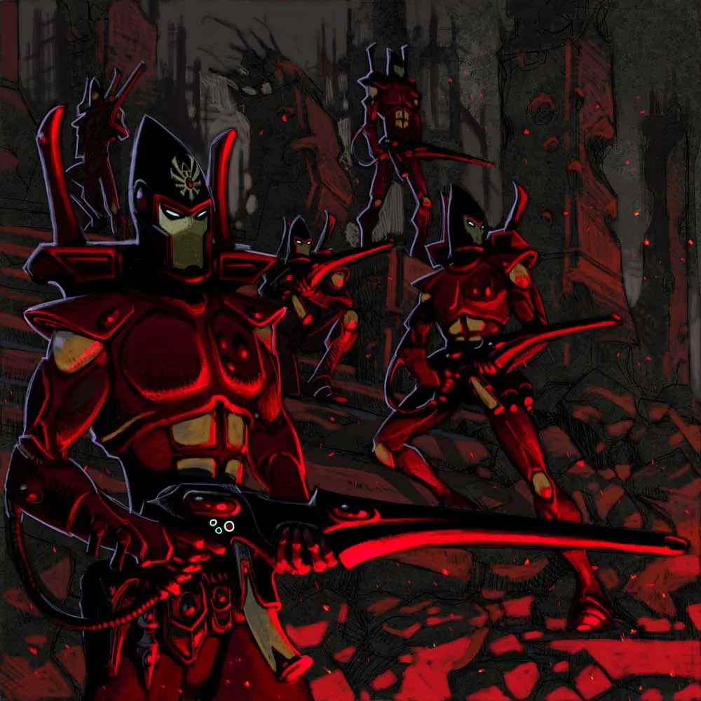 Тускло-красный свет солнца едва пробивался через грозные чёрные тучи, превращая огромные кварталы в гробницы и окрашивая окна в цвета крови. Повсюду среди руин разрушенного города было движение; прибывали эльдары. Стоя на высочайшей башне в городе, за ними наблюдал довольный провидец Карэдрон.