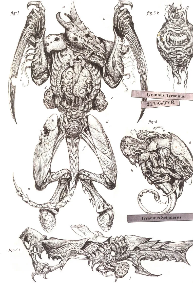 Наиболее понятны из всех созданий тиранидов - генокрады и карнифексы, производящие особый звук при ударах своими серпообразными придатками. Но даже эти твари в деталях различаются друг от друга, в особенности по размеру и окрасу. Имперским войскам известны и более мощные создания, так называемые Тираны Улья, способные манипулировать меньшими тварями. Техномаги считают, что и все тираниды контролируются подобным образом единым мозгом, Королевой Улья, но все это лишь догадки.
