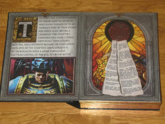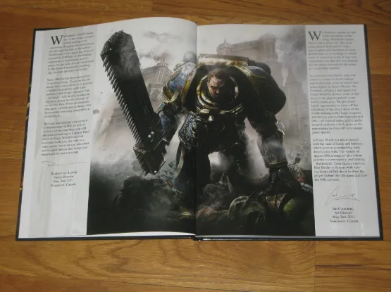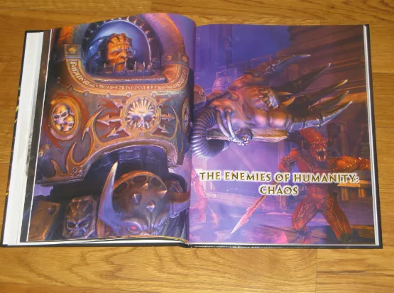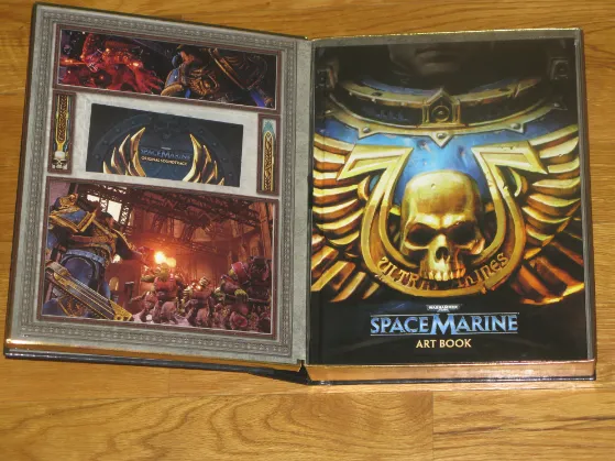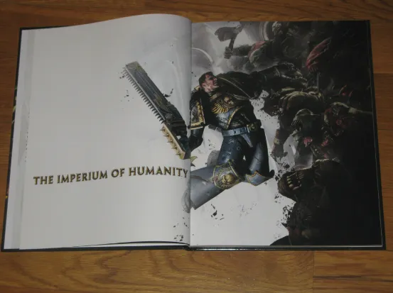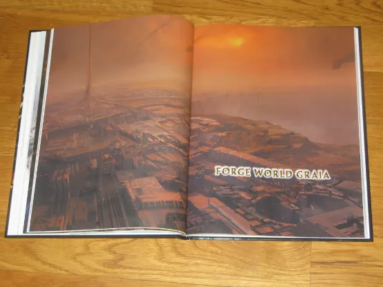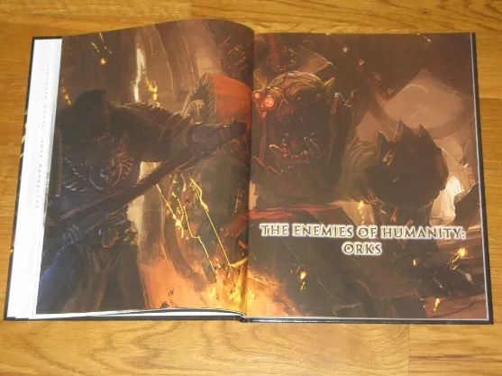 Идем дальше. Взглянув чуть правее, мы находим приятный артбук в твердом переплете, размером А4. В общем, в него входят 100 страниц арта из игры, который подразделяется на четыре раздела: «The Imperium of Humanity», «The Enemies of Humanity: Orcs», «The Enemies of Humanity: Chaos», «Forge World Graia».