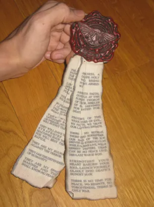 На правой же части мы можем наблюдать десятидюймовую Печать Чистоты, крепко лежащую в бархатном кармашке. К печати приклеены две расписные шелковые ленты. К слову, холодильник очень рад присутствию данного аксессуара на нем.