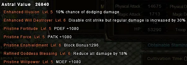Blessed Health (10% шанс получить X здоровья при атаке) – как и в случае с Deflection, работает не всегда, поэтому полезность этого астрала сомнительна по сравнению с более стабильными версиями (например, снижение урона от Goddess Blessing). Такой астрал, скорее всего, подойдет рыцарю, если он прибегает к тактике множественных рандомных отхилов, и, помимо лечения с данного астрала, вылечивается с одного из пассивных умений во время блока урона, а также войска ангелы случайно отхиливают одну из союзных целей.