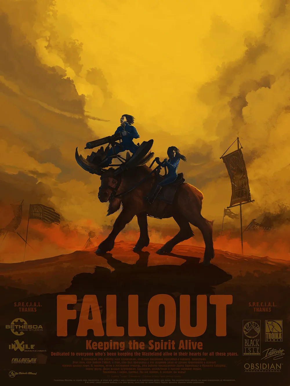 Это было чертовски интересно, но мне хотелось большего. Так родилась «группа лося» собирательный образ посвященный всем разработчикам, которые так или иначе прикасались к серии Fallout. Дело в том, что Wasteland 2 раскручивалась не иначе как Мать всех пост-апокалиптических рпг, и акцент делался на том, что все, что было позже – дети и отпрыски. Сейчас, по прошествии времени, уже не понять, что это. Поэтому чаще всего слышно, - Никто не обещал вам Fallout.
