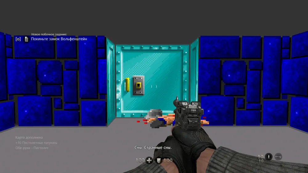 Для того, чтобы очутиться в этом "куске" - нужно после побега из тюрьмы подняться на третий этаж, там где вы ещё берете ломик по сюжету и пройти в упор к кровати. Разработчики нас сразу предупреждают, что если мы уснем, то увидим кошмар. Смело зажимаем "E" и просыпаемся в почти что в игре "Wolfenstein 3D" (насколько я понял, так как сам являюсь ньюфагом и ни в одну игру из этой серии не играл).