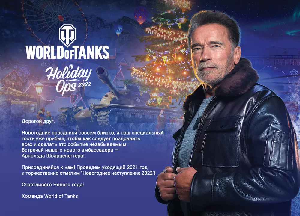 «Работа с командой Wargaming над этим особым проектом была отличным опытом — тем более мне известно, сколько радости он принесет миллионам игроков! — говорит Арнольд. — С танками меня связывает давняя история: у меня есть M-47 Patton, на котором я проходил службу в австрийской армии, когда мне было 18, так что мне знаком восторг, который испытываешь, управляя этими стальными зверями! Пользователи reddit годами спрашивали, когда же ждать моего появления в World of Tanks? Кажется, их мечта сбылась. Так что отложи праздничное печенье и готовься к „Новогоднему наступлению“ вместе со мной!»