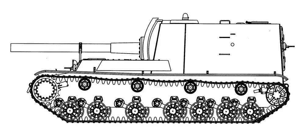 Тем не менее, при всех своих недостатках (невысокая мобильность, трудоёмкость в изготовлении, низкая живучесть ствола) Бр-2 обладала высокой мощностью. В номенклатуру боеприпасов Бр-2 входили два типа боеприпасов: осколочно-фугасные 53-ОФ-551 массой 48,9 кг и бетонобойные 53-Г-551 массой 49 кг. Начальная скорость снаряда 53-ОФ-551 составляла 880 м\с, максимальная дальность выстрела – 25 км (для орудий с мелкой нарезкой этот показатель составлял 27 км). В случае попадания любого из этих снарядов в танк или бронемашину итогом являлось полное их разрушение. Конструктивно орудие Бр-2 состояло из ствола (длиной 47,2 калибра), затвора поршневого типа, лафета, гидравлического тормоза отката и гидропневматического накатника. Заряжание орудия – картузное, но для облегчения подачи снарядов с грунта имелся специальный кран с лебёдкой. Для того, чтобы разместить на базе КВ эту артиллерийскую систему пришлось значительно доработать ходовую часть. Число опорных катков увеличили с 6 до 7, причем в задней части расстояние между ними было сокращено, а в средней (менее нагруженной) – увеличено. Поддерживающих катков осталось 4, однако в виду изменения компоновки ведущее колесо перенесли вперёд. Направляющее колесо с винтовым механизмом натяжения гусениц теперь располагалось сзади. Подвеска самоходного орудия осталась независимой торсионной. Гусеница самоходки была мелкозвенчатой с шириной траков 660 мм. Изменения в конструкцию шасси были внесены по причине полного перепроектирования компоновки. Боевое отделение располагалось сзади и, частично, в средней части корпуса. Отделение управления, в котором находились места механика-водителя и стрелка-радиста, находилось между трансмиссионным и моторным отделением. Корпус был сварным и собирался из катаных броневых листов толщиной 20, 30, 50 и 60 мм.