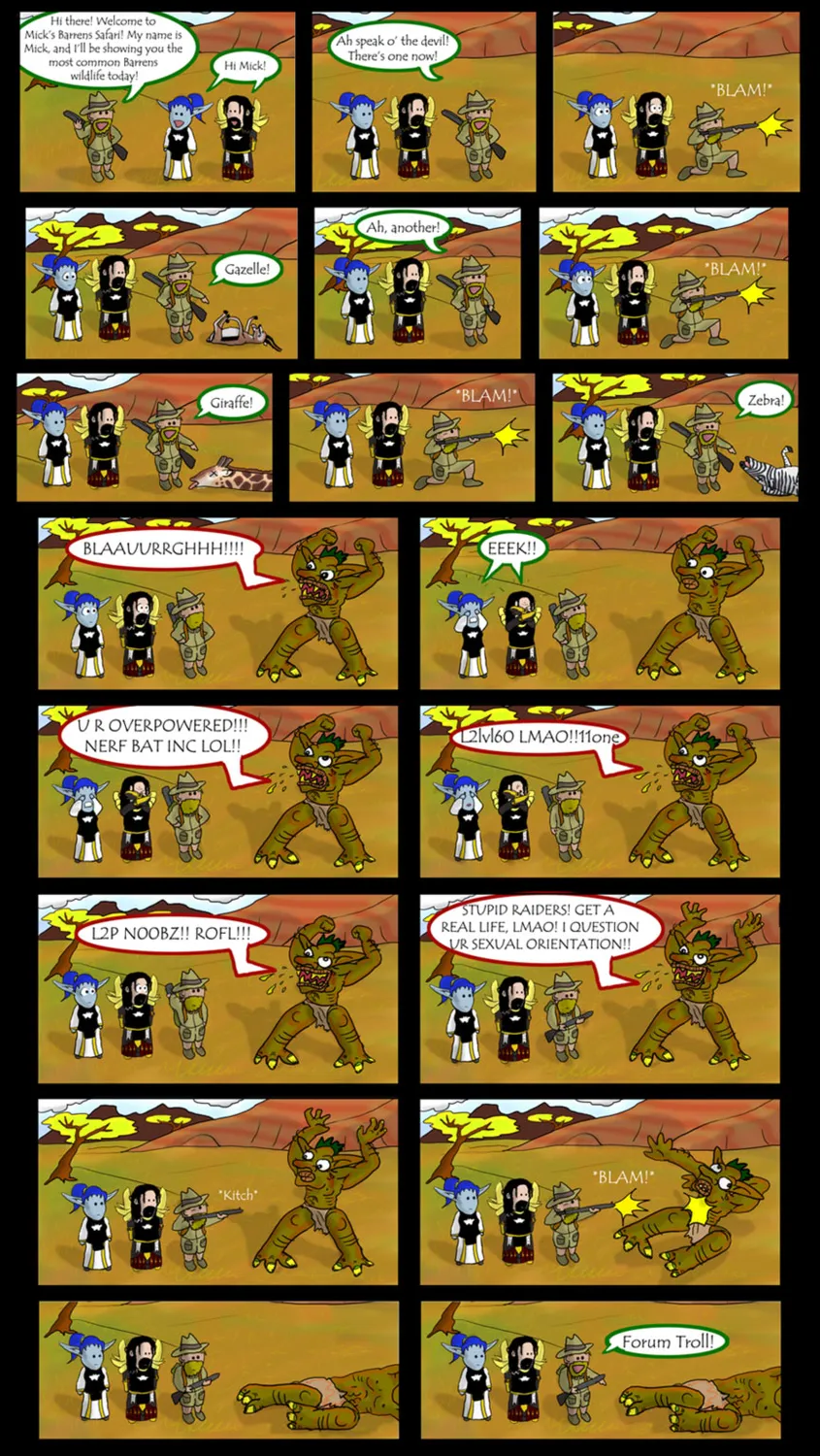 - Те же, кто остался прокачивать мейнов или успешно прокачал Рыцаря Смерти до невиданных высот перенесли барренс чат в инстанс Цитадель Ледяной Короны, где к разговорам о половой и расовой принадлежности добавились дискурсы про DPS, lewt dr0ps и гоп-выпендреж. Так же фармящие и просто ничего не делающие "большие дяди" троллят друг друга в Ледяной короне. В моменты тишины, дабы ее прервать, особо умные тролли закатывают веселую тему чтобы раскрутить людей на разговор. Это обычно начинается сообщением размера "органа" постороннему игроку, началом вступительной темы спанч боба и подобной бабуйней, тем самым намекая на уровень своего IQ и/или принадлежность к школьному возрасту. Подобные попытки обычно заканчиваются оскорблением друг друга по поводу и без повода. Тем самым тролль добивается своей цели. Когда же ситуация снова утихает, операция повторяется.