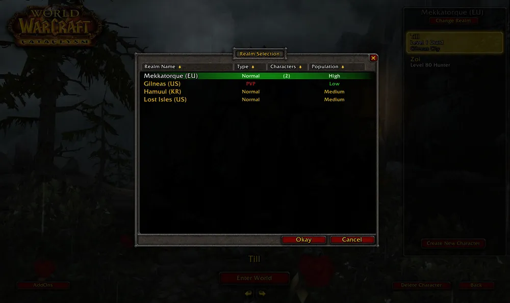 Если что, моих чаров зовут Till (ворген друид 1 лвл) и Zoi (найт эльф охотница 80 лвл).