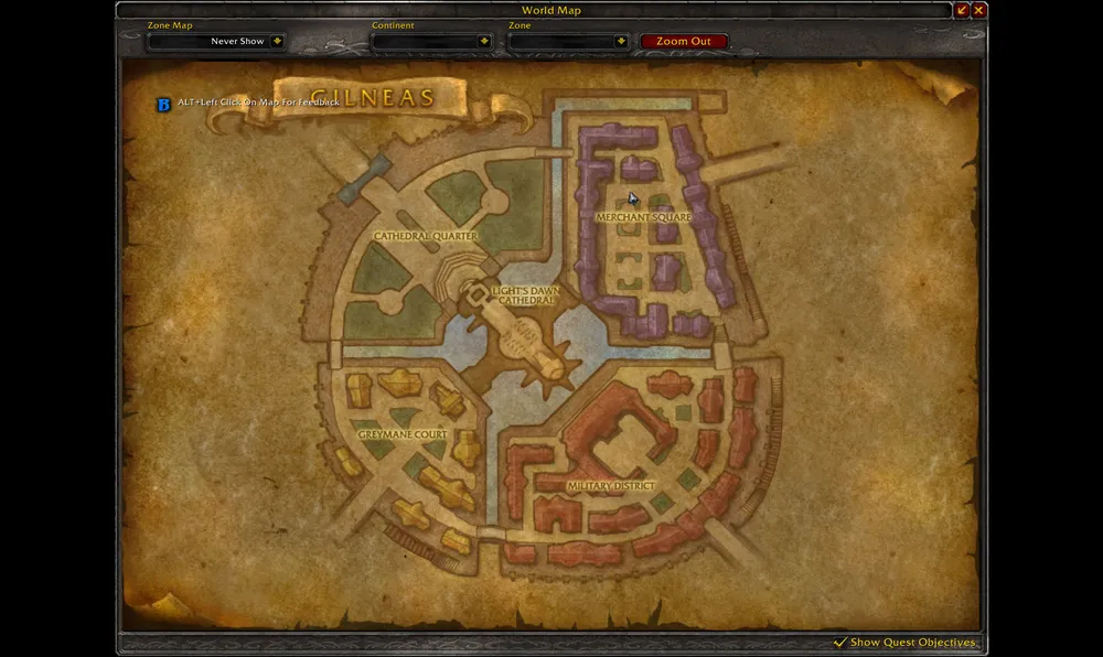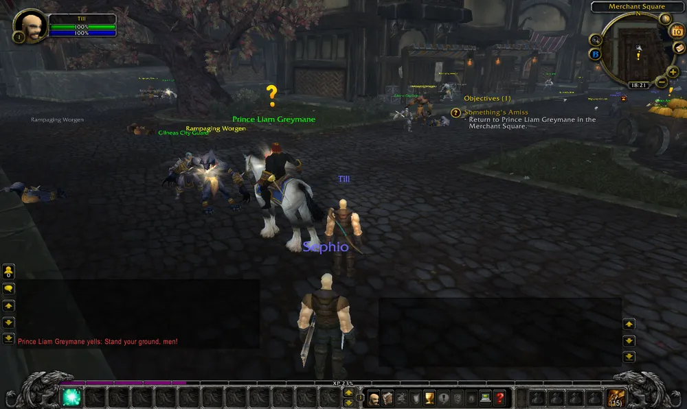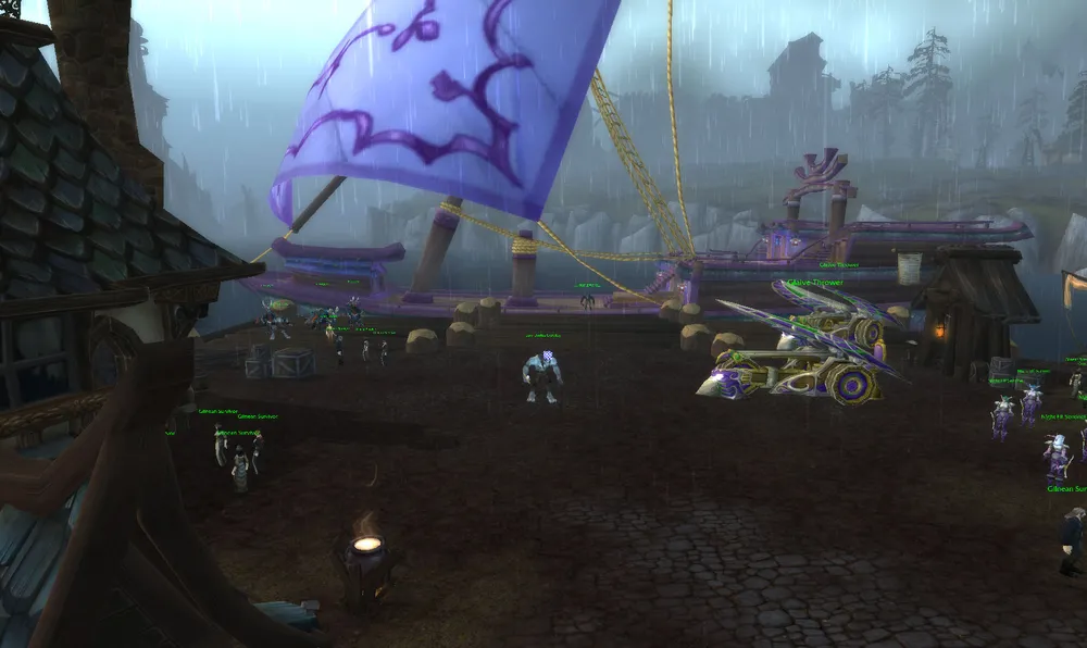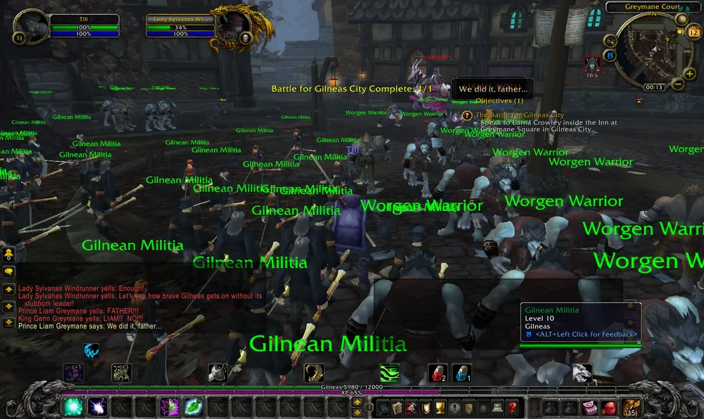 Я получил квест "Битва за Гилнеас", говорят, это мощное событие, но как-то мне с ним не повезло. То ли я не по расписанию попал, то ли с фазированием опять были проблемы, но мне пришлось в одиночестве бежать через половину города, рассматривая трупы нежити. В итоге я пришел на площадь, где увидел следующую картину: