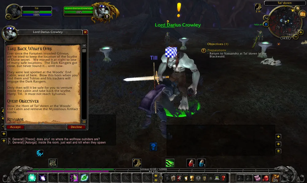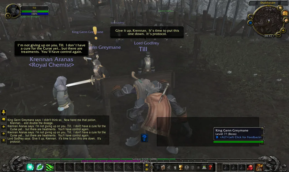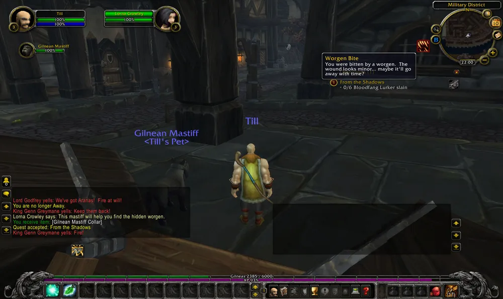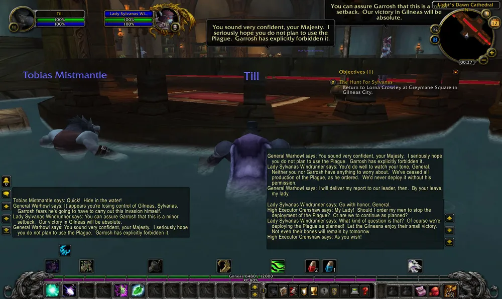 Целая толпа солдат расстреливала Сильвану, которая собственной персоной явилась на захват Гилнеаса. Через некоторое время Сильвану это дело достало, она замочила принца Гилнеаса и смылась. Вслед за этим мне дали задание проследить за ней и выведать ее планы. Следуя за воргеном-NPC, я попал в церковь, в которой уже бывал на ранних этапах. Мы спрятались в воде, пришла Сильвана и какой-то оркский генерал. Оказывается, Сильвана та еще засранка. Если ранее считалось, что новая Чума нежити создана Гнилессом (Putress), а Сильвана как бы и не при делах, то тут выходит, что Сильвана сама отдает приказ обработать чумой Гилнеас. Что самое интересное, Гаррош постановил запрет на такие действия, но Сильване на него плевать.