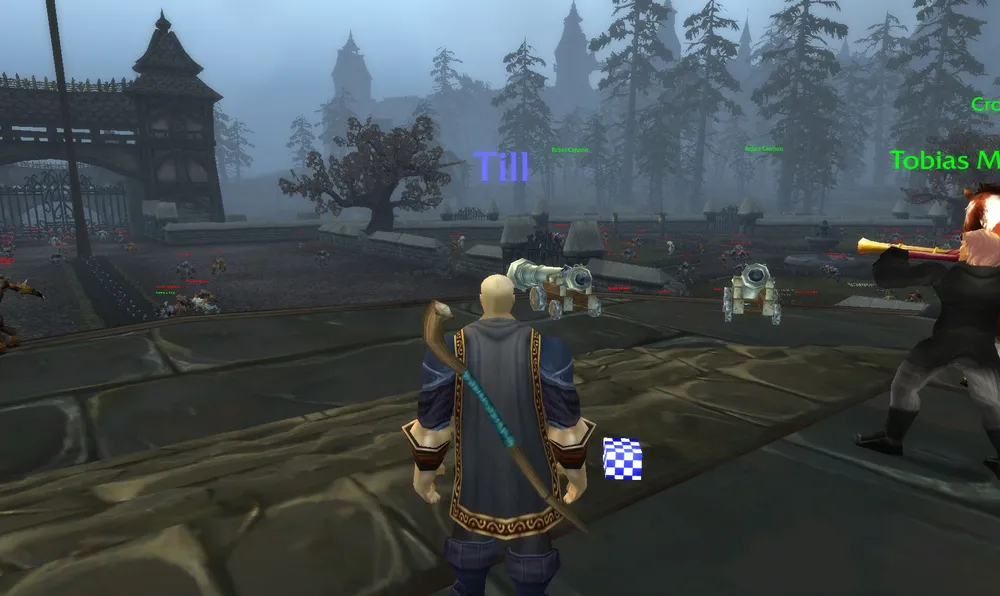 Вот тут можно видеть пушки, из которых нужно стрелять по воргенам. А справа от моего персонажа лежит кубик. Это объект без модели и текстуры, обычно такое можно увидеть только в бета-тесте. :)