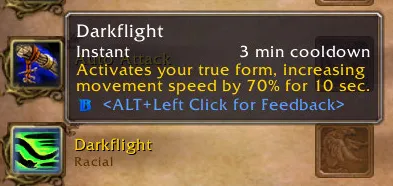 Darkflight - воргеновский "спринт", ускоряет на 70% в течение 10 секунд. Кулдаун 3 минуты.